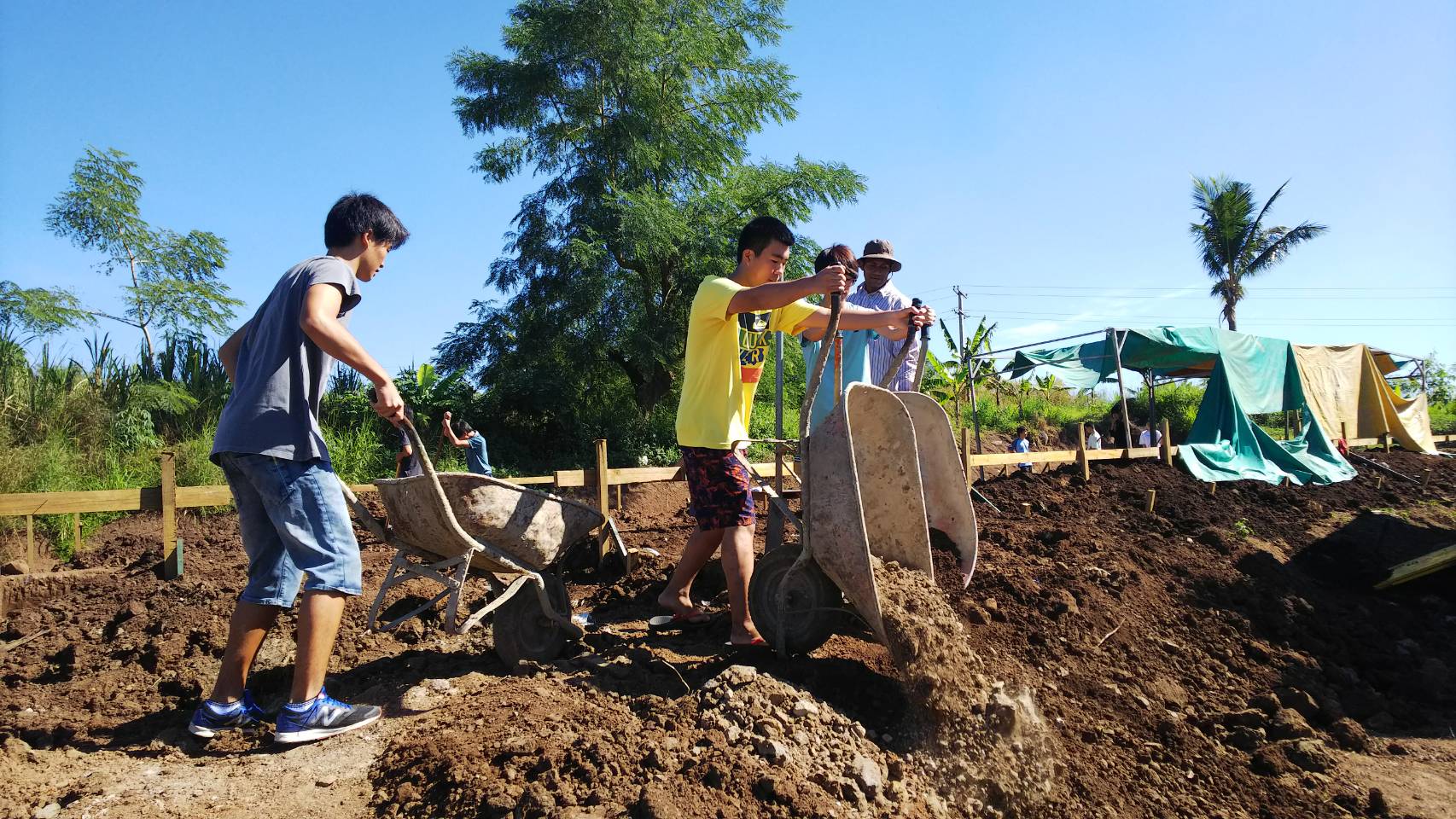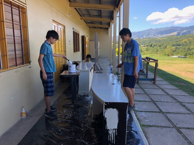 その後、数人に分かれて机の色塗り、新しく建てる建物の土台作りや