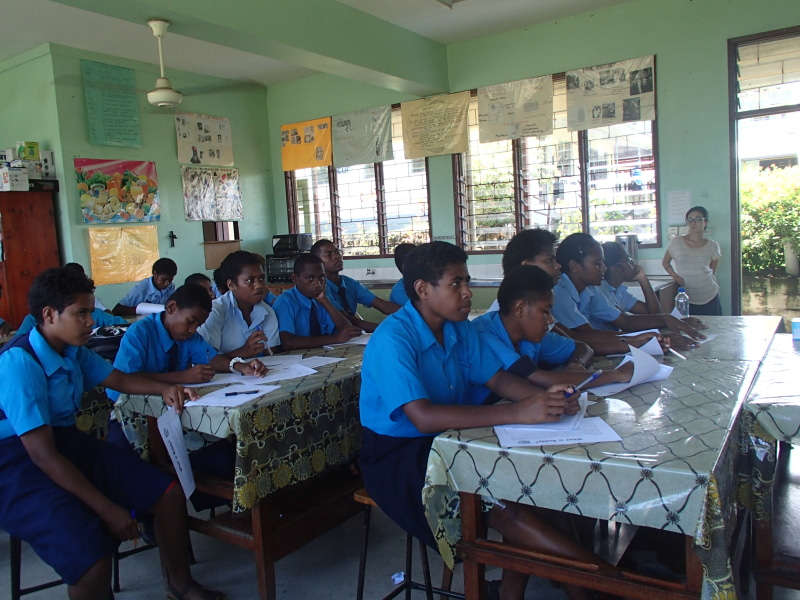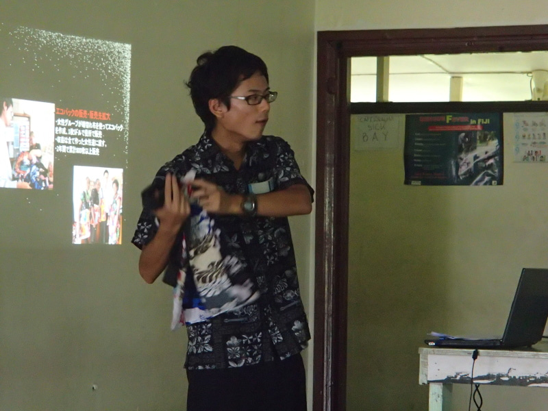 He is working at Rakiraki, to improve Fijian Education. In Fiji, Music, Arts and PE class are not common as Japan. So he is trying to improve those subjects for better education.