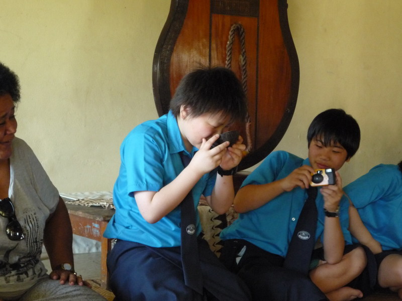 フィジーの儀式では必ず飲み交わされるカヴァ(植物の根を乾燥させて粉状にし、水に混ぜた飲み物)にも初挑戦し、「思ったより苦くない!」「おいしくない!薬みたいな味がする!」とそれぞれの感想を口にしながらも、初めての体験にみんな興奮気味の様子でした!