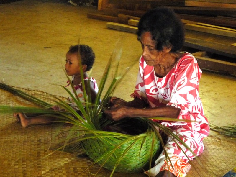 のジュースやフルーツのグァバを頂きながら、フィジーでの伝統的な織物作りを見学しました。