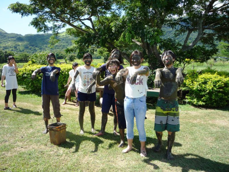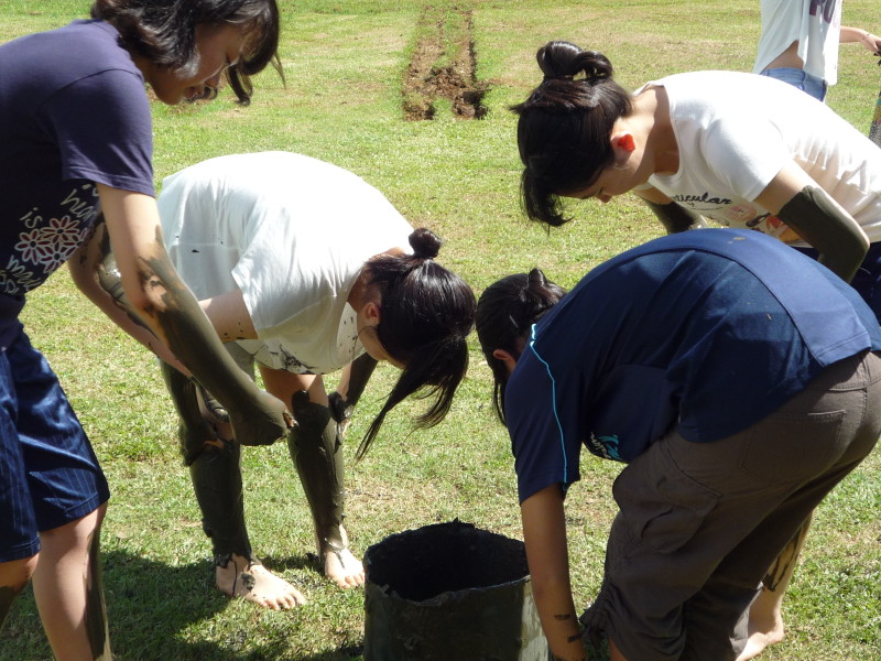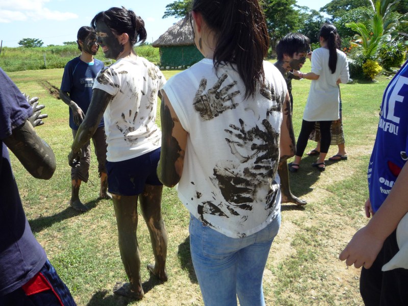 周りにいた大人たちは、泥を塗って静かに乾くのを待っている様子ですが、さすがお年頃の学生達!早速泥合戦が始まりました!