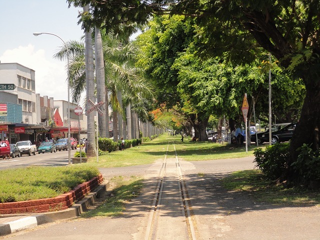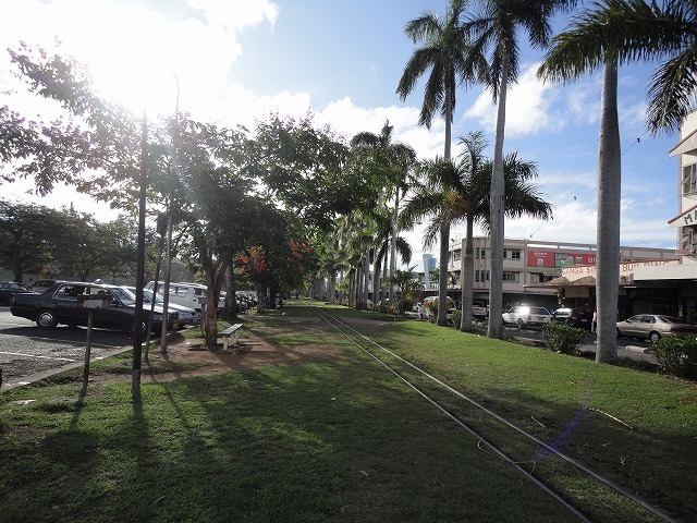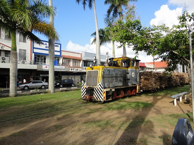 町の大通りのすぐ脇をサトウキビ列車が高らかに汽笛を鳴らしながら走ってきます。